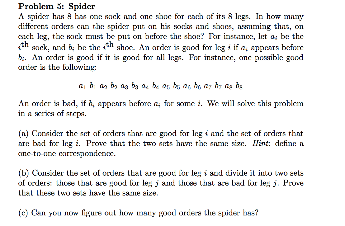 50 out of 5 stars 25. In how many different orders can the spider put on its socks and shoes assuming that on each leg the sock must be putonbeforetheshoe. On each leg the sock must.